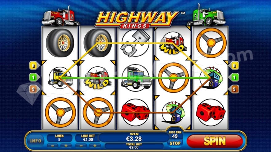 Highway Kings is a video slot from Playtech with 5 reels, 3 rows, and 9 paylines. Players can choose between a Min.bet of 0.01 and a Max.bet of 9. This game has an above-average RTP of 97.05% and a hit frequency of 59.99%. Highway Kings has low volatility and a max win of 2297X the bet, which has an average win frequency of 1 in 3,000,000,000. The frequency of wins over 1000X in Highway Kings is 1 in 1,257,862 spins.