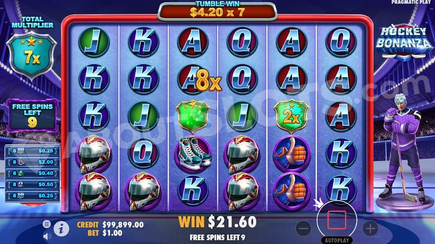 The lower-paying symbols at the stadium are 10, J, Q, K, and A. Making wins with 12 or more of them awards between 2X and 10X the bet. The higher-paying symbols are hockey glove, ice skates, helmet, and stick. If you land a win with 12 or more of those symbols, you’re awarded between 12X and 50X the bet. There’s no Wild Symbol, and the Scatter Symbol, which can trigger the Free Spins, awards 3X, 5X, and 100X for wins made with 4, 5, or 6 symbols.