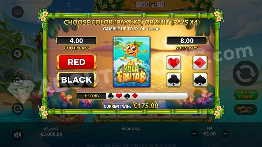 All wins can be gambled up to 5X in an all-or-nothing game. The player gets to foretell a playing card by choosing its color (red or black) or its suits (hearts, diamonds, spades, and clubs). Guessing the right color will double the win, and the right suit will quadruple it. Guessing wrong equals losing the win completely.