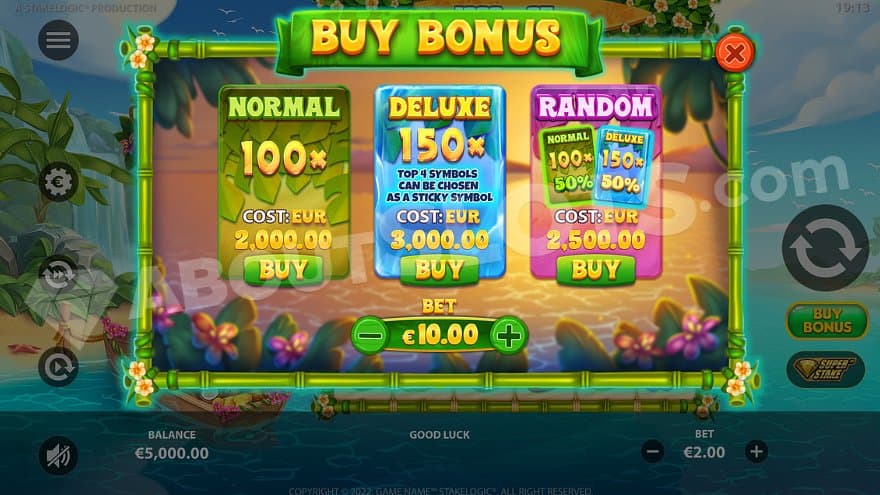 Among palm trees and green sea water awaits the features Cascading Wins, Scatter Symbol, Wave Feature, Gamble, Super Stake, Multiplier and Question Mark Symbols, Free Spins, and Bonus Buy.