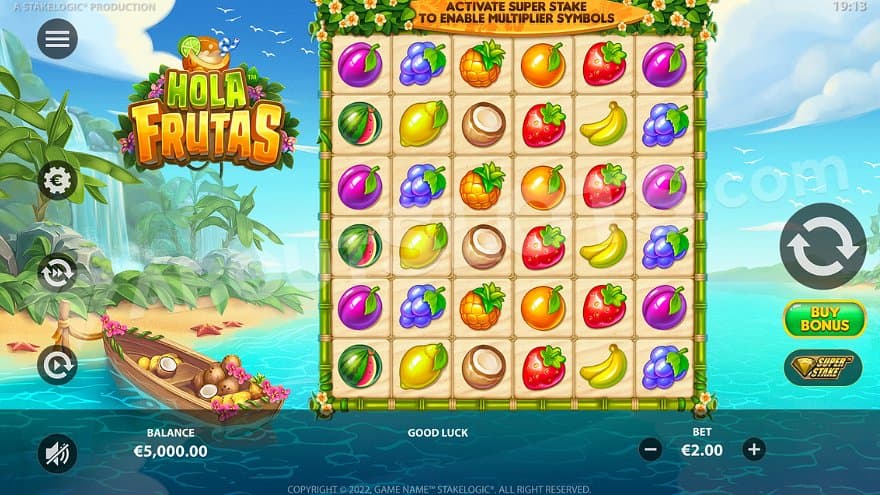 Hola Frutas literally means "hi fruits" in Spanish. It's not clear where the game takes place, but we assume Stakelogic has taken us to a Spanish-speaking destination. Looking at the tranquil blue-green water and beautiful sand beaches makes us believe we're somewhere in the Caribbean. To the left of the reels is a rowing boat full of coconuts anchored to an island with a waterfall, and some white birds are flying from right to left in the distance while a guitar is playing a relatively slow backbeat song. To make a win on the 6X6 grid, you'll need to land at least 8 of the same symbol type anywhere. You know how the mechanic works if you have played games such as Banana Town or Volatile Vikings 2 Dream Drop. Hola Frutas is available for everyone connected to the internet, whether by mobile phone, notepad, or desktop computer.