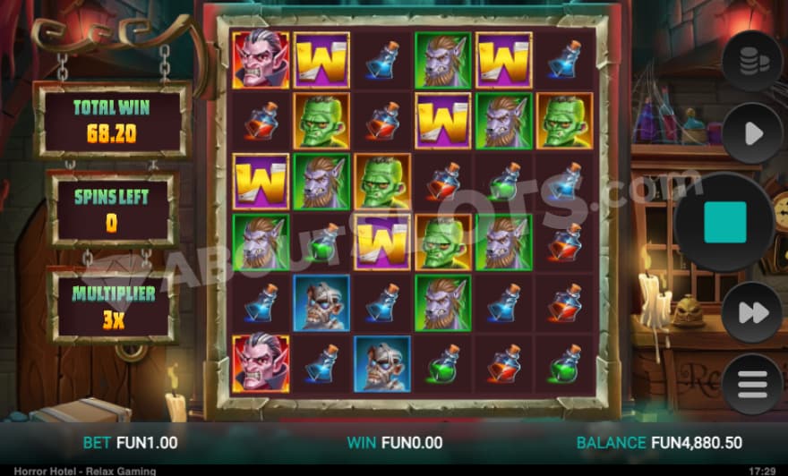 Horror Hotel is a video slot from Relax Gaming that features 6 reels and 6 rows. You create a winning combination by landing 5 or more of the same symbol type in a cluster, which then activates the mystery symbol feature. You can choose between making a Min.bet of 0.10 and a Max.bet of 50. The game has a higher-than-average RTP, where we have an RTP of 96.17%. Horror Hotel has a high volatility, where you can win up to 20000X the bet.