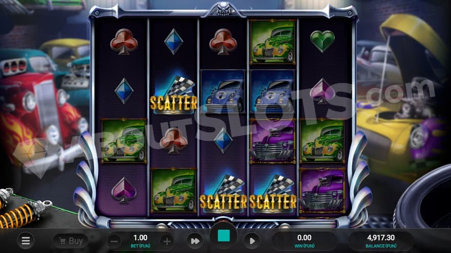 The lower-paying symbols are the suits from a playing card deck. They all pay the same, and landing a win containing 5 spades, clubs, spades, hearts, or diamonds awards 2.5X the bet. The higher-paying symbols are four pimped-out hot rods. There’s a little blue one that must be a Volkswagen Beetle, and then comes a green one with fire flames, a red one with pipes coming out from the hood, and a purple with a death skull on the front. Landing a win containing 5 cars awards between 5X and 10X the bet. The Wheelspin Wild and the Nitro Wild Symbols substitute all mentioned symbols, but not the Scatter.