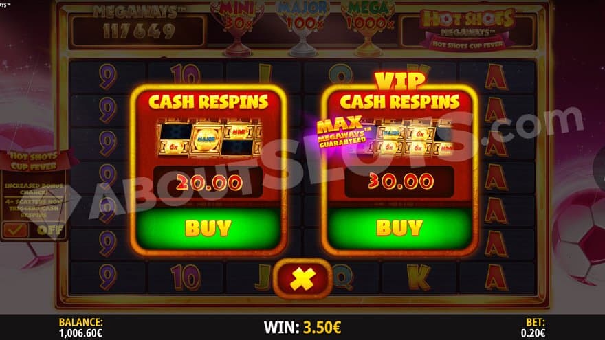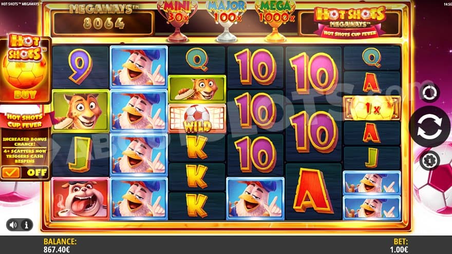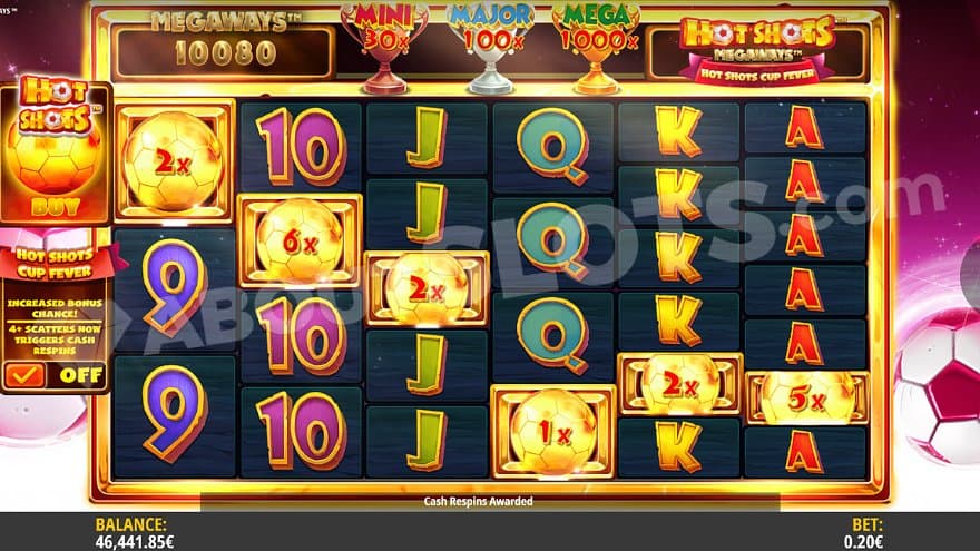 The Hot Shots Cup Fever is an ante bet you can turn on to increase the chances of activating the Cash Respins. You’ll only need to land 4 instead of 5 scatters to trigger the feature. The Hot Shots Cup Fever costs you 25% of your bet. Playing with the Cup Fever bet increases the RTP to 96.48%.
