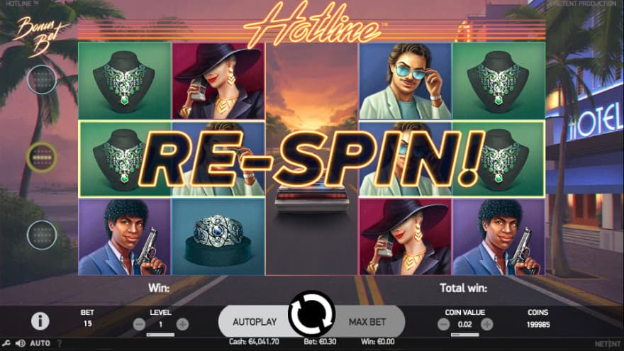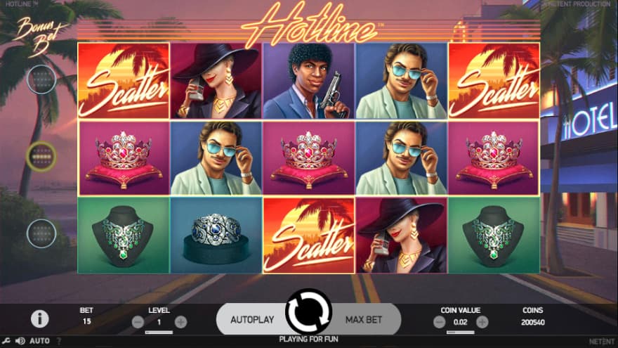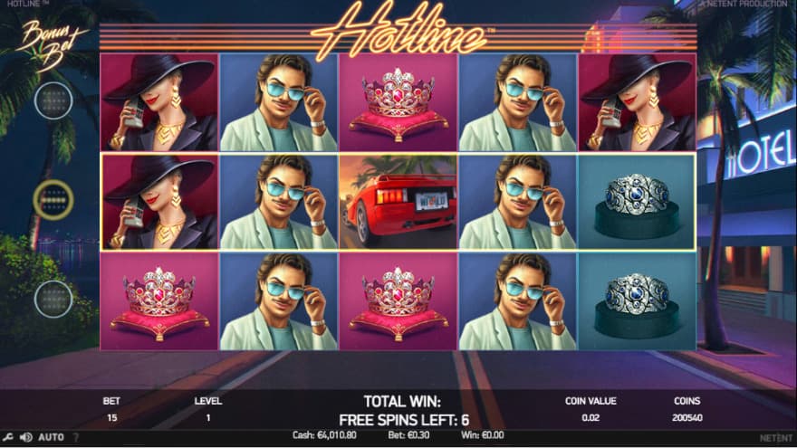 In this online slot from NetEnt, we are transported back to the 80's in Miami. A lovely time when fast cars, mullets and neon lights were in focus. This is the first slot created by NetEnt that has their Hotline Bonus Bet mechanic that allows the player to interact and influence their bet in a whole new way. This slot quickly turned out to be popular among players and it didn’t take long before Hotline 2 was created. But let's focus and find out what made this slot so unique and what it has to offer.