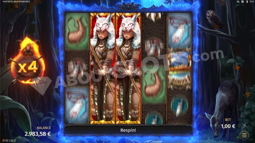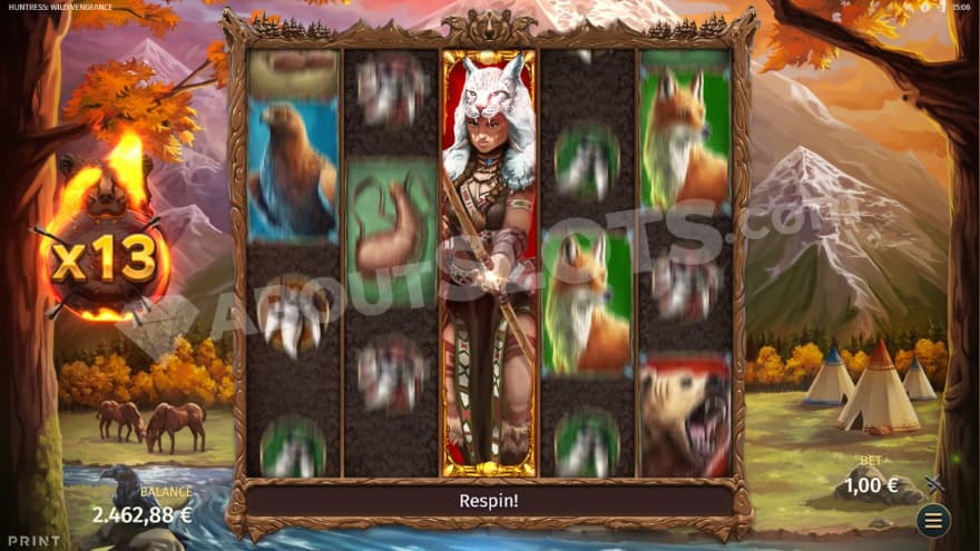 If you land 3 or more scatter symbols, the free spins feature is activated. You will then receive 10 free spins and if you land 4 or 5 scatter symbols, you will also receive an instant win of either 20X or 100X. Within this bonus game, the total win multiplier created during the Huntress Wild feature will not be reset between spins but will only be applied during a Huntress Wild feature.