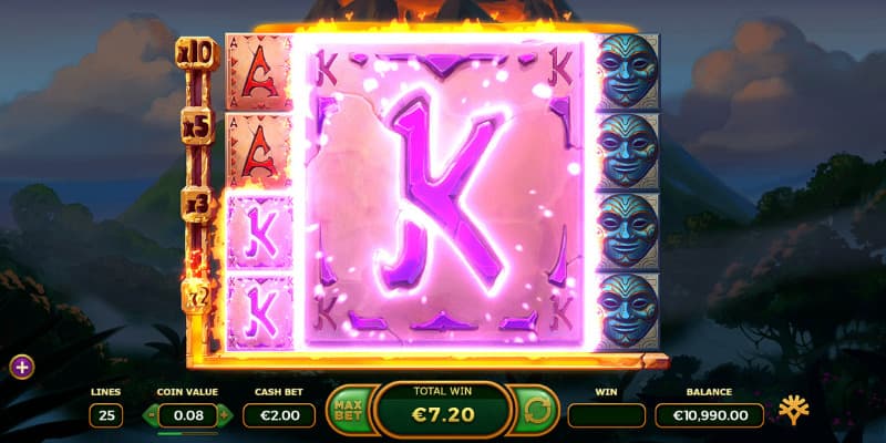 In this game with a volcano as the main theme, it will not spray lava, but instead it may spray respins, where these give extra bonuses. Each win made generates a respin, where 2 of the 4 reels in the middle will merge into 2X2 in size. Hold on because now a really exciting journey can come. Because if you win on the next respin, your 2 big reels turn into 3X3. If you also win on this respin, you get 4X4 reels. With reels of this size, incredible winning opportunities are created. This can continue as long as consecutive wins are made. After you have received 4X4 reels, winnings after that will increase your multiplier instead. From 2X, 3X, 5X all the way up to 10X.