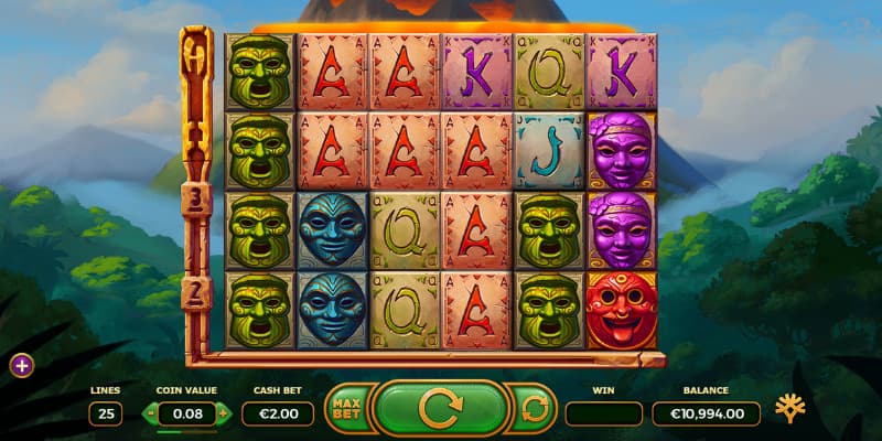 Here we are transported into the deep jungle. Where in the background of the game we can see a large volcano that has a large eruption and hot lava is bursting out from it. This volcano is surrounded by the green deep jungle. In this slot you can take part in 9 different symbols. Where the 4 lower paying symbols consist of J, Q, K and A. The higher paying symbols consist of masks, which come in the colors blue, green, purple and red. Where the red is the one that gives the highest payout of these. The ninth and final symbol that can be found on the game's reels is the Wild symbol, which has a large text that says just that, Wild. The game's winnings will play a big role in how future spins will be, which we will mention more below. Oh I put many things forward in this text, but a small cliffhanger never hurts ... On the left side of the game reel, we have a meter that will show these different levels that you have achieved. The game's music gives a very adventurous feeling and during these fast-paced spins that are made, you become very motivated to play for a long time.