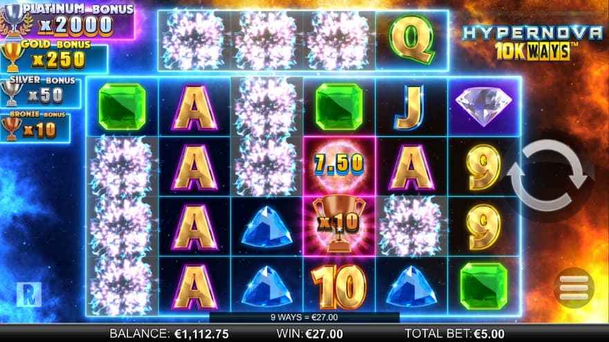 The game's design consists of a space theme, where in the background of the reels you can see a galaxy that shows strong blue and red colors. On the left you can see the four different bonuses that can be obtained, which give 10X, 50X, 250X and 2000X. The top reel will add one symbol each to the reels 2, 3, 4 and 5. You can play Hypernova 10K Ways on all desktops, notepads and mobiles. You create a winning combination by landing 3 or more of the same symbol type on adjacent reels starting at the far left. The highest paying white diamond creates a profit already when two symbols have landed and it then gives 2X.