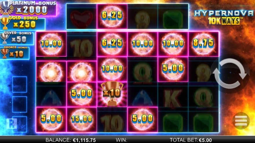 This is truly a slot whose name hypes up the potential within it. ReelPlay uses the same space theme that they have used in previous versions within this concept. It is a solid reel setup that you play on, where with the help of 6 reels, 4 rows, top reel and a 10K Ways mechanic you get up to 10000 ways to win. Although this is a large number of ways to win, we have had the chance to take part in much more within their Hypernova Megaways which could give up to 117649 ways to win. The base game offers a bunch of decent spins, where the wild symbol helps to create more winning combinations and the cascade feature sometimes gives many subsequent wins during the same spin.