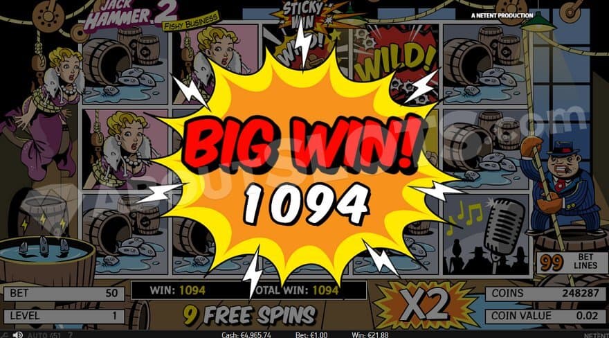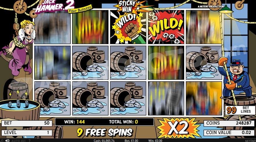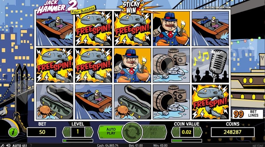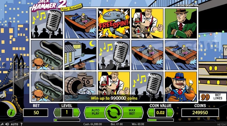 Jack Hammer is a video slot from NetEnt on 5 reels, 3 rows, and 99 paylines. The action-packed detective story has low volatility and an RTP of 97.07%. Players can put their stakes from the Min.bet 0.50 to the Max.bet 250. Making the best out of your time in the Fishy Business can bring the max win of 1980X the bet.