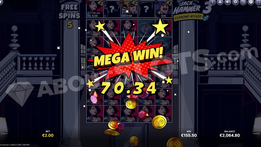 Jack Hammer 3 is a video slot from NetEnt with 5 reels, 6 rows, and a scatter pays system, awarding wins whenever 8 or more symbols of the same kind land anywhere on the grid. The RTP is 96.08%, but you should be aware that NetEnt is also releasing versions of 94.05% and 88.04%. Jack Hammer 3 has a Min.bet of 0.2, and a huge Max.bet of 2,000. The volatility is medium, and the max win is capped at 1,332X the bet.