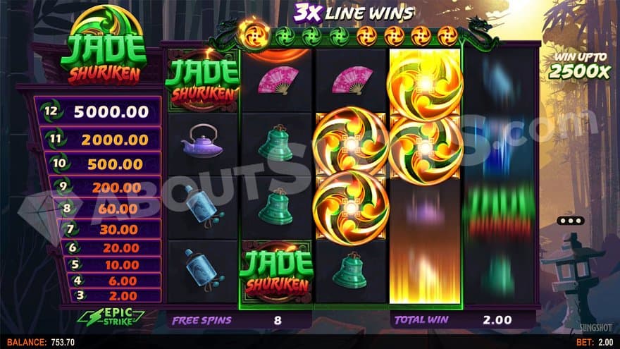 The Epic Strike feature triggers whenever you land 3 or more bonus symbol shurikens. The symbols pay 1X, 3X, 5X, 10X, 15X, 30X, 100X, 250X, 1000X, or 2500X for landing 3, 4, 5, 6, 7, 8, 9, 10, 11, or 12 shurikens. The win is awarded apart from any other regular win.