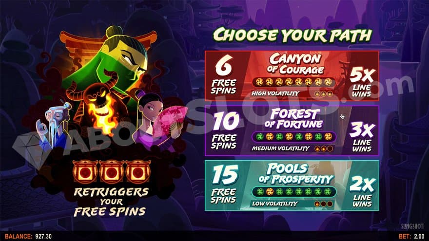 The player gets to choose between three free spin options with low, medium, or high volatility. The options are 15 spins with a 2X multiplier, 10 spins with a 3X multiplier, or 6 spins with a 5X multiplier. The chances of triggering the Epic Strike Respins are greater the fewer spins you choose. The 6 spins option will have the yellow bonus symbol on all spins, the 10 spins option will at least give you four yellow shurikens in the trail above the reels, and the 15 spins option guarantees to give you one respins symbol on the trail. Free spins can be retriggered with the same number of spins and multiplier by landing 3 scatters.
