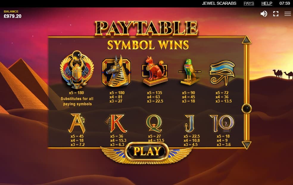 The features of this game all revolve around the one symbol, but they do make the game more interesting to play and pay amazingly well. The main symbol is the golden scarab. It is a wild and scatter symbol, depending on the amount that appears on the reels. The symbol can act as a wild that replaces all other symbols and is there to help create winning combinations.