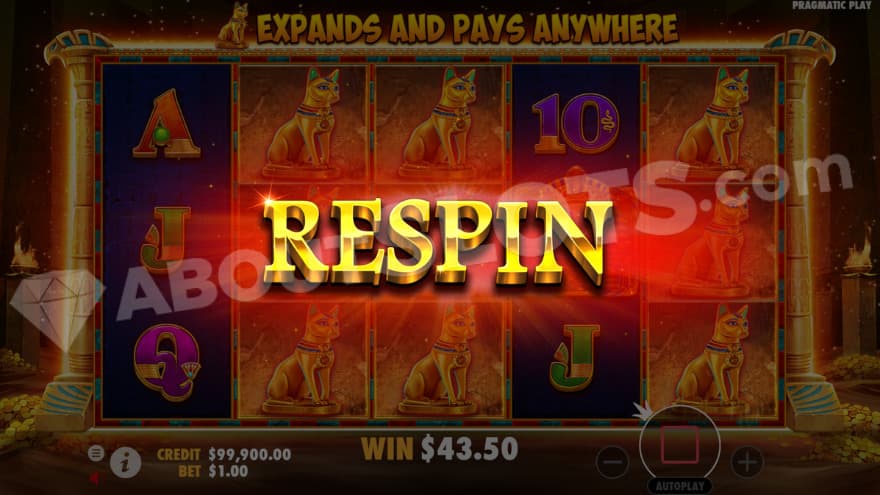The re-spin is activated every time you land 3 or more of the chosen mystery symbol, both in the base game and during free spins. It gives you a chance to land additional symbols for a higher payout. This feature is extremely helpful in your quest for big wins.