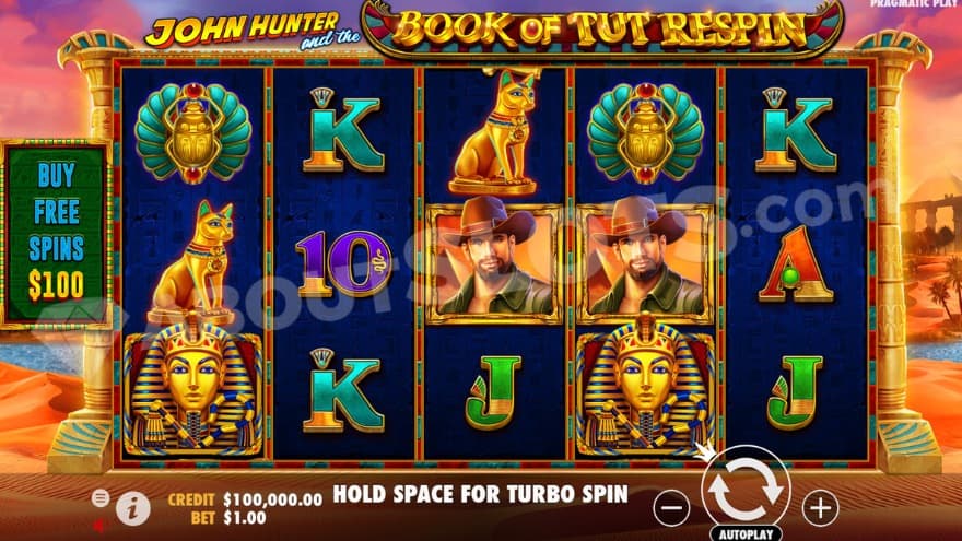 John Hunter and the Book of Tut Respin is a video slot from Pragmatic Play with 5 reels, 3 rows, and 10 paylines. You can choose between a Min.bet of 0.10 and a Max.bet of 100, so you should be satisfied whether a casual player or a high roller. The game is created with 3 different RTPs from which casino operators can choose. The highest RTP is 96.5%, which is excellent and above average. But casinos can also choose to set it at 95.5% and 94.5%, so be on the lookout for that. John Hunter and the Book of Tut Respin is played with high volatility and a max win of 4000x.