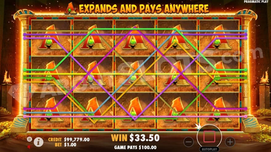 The game takes place in what we believe to be Egypt. We’re in the desert, but there’s a beautiful river flowing in the background, perhaps the Nile. Something we like is that the surroundings are alive. The clouds and the river are constantly moving. You don’t notice it too much, but if you were to turn it off, the game would suddenly feel a lot duller, so we appreciate the effort to prevent that. Pragmatic completes the setting with fitting symbols such as scarabs and pharaohs. Although, it would be cool to see providers deviate from the classic 10-A symbols more often because it doesn't necessarily fit in with the theme. However, they have become such an integral part of iGaming, so we will probably just have to accept that.