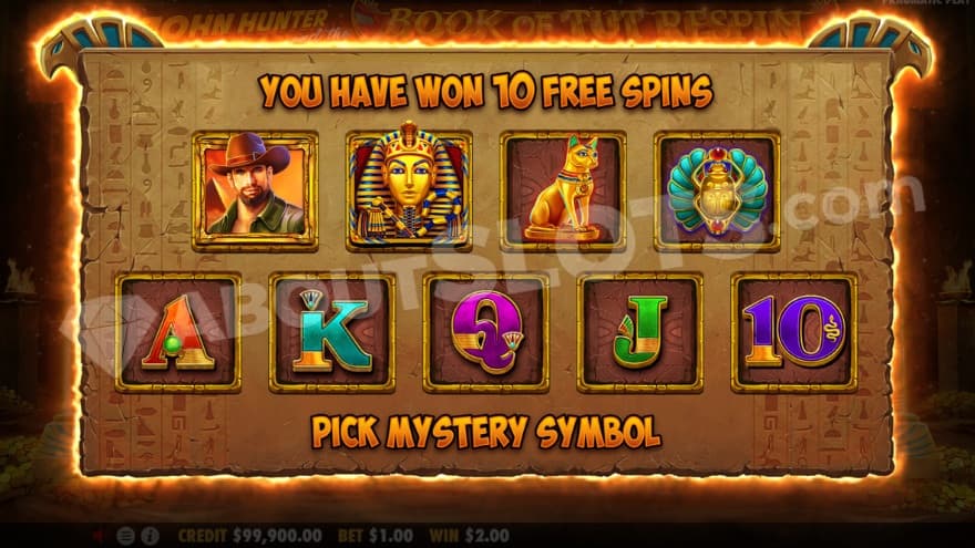While helping John Hunter search for the Book of Tut and the riches that come with it, there are some fantastic features to help you along the way. The features are Mystery Symbol, Scatter, Symbol Respin, Free Spins, and Bonus Buy.