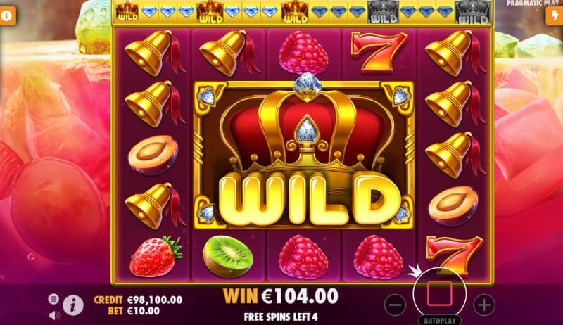 In this slot you really get to partake in a fruit salad with juicy symbols. Where the lower paying symbols consist of lime, cherry, lemon and orange. The medium paying symbols are peach, bell, strawberry and kiwi. The higher paying symbols consist of raspberries, watermelon and lucky 7. If you get 5 of the lucky 7 symbol, it gives 24X the bet. All symbols are wonderfully designed, and it makes one's mouth water during the spins. The game's most special symbol consists of a golden crown with the text wild on it. We tell you about its wonderful features a little further down. By landing 3 or more of the scatter symbols, the free spins feature is activated. This scatter symbol consists of a giant diamond with the text scatter on it. A very catchy tune will be played during the spins and it gives that little extra needed to maximize the gaming experience. Let's find out what the features do.