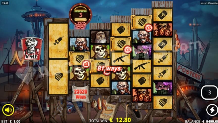 The game design consists of a Karen theme, where we get to go on a different gaming adventure together with this man loving woman. In the background of the reels, you can see a post-apocalyptic place where you can glimpse the head of the statue of liberty. There is a tactful music playing in the background that puts you in the mood quickly, where its tones add an extra depth to the spins. You can play this slot on all the devices notepads, desktops and mobiles. You create a winning combination by landing 3 or more of the same symbol type on adjacent reels that start at the leftmost reel.