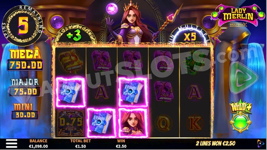 The Wild Symbol is a picture of Lady Merlin in an electrified golden frame. It can appear anywhere and substitutes all regular paying symbols.