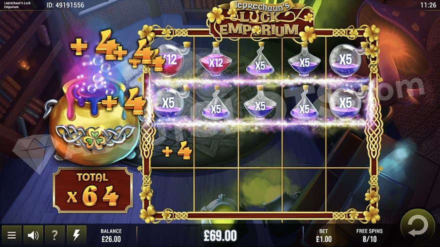 The Free Spins start with 8 spins, no matter if you triggered the feature with 4, 5, or 6 Scatters. It is played on a smaller grid with 5 reels and 4 rows. On every spin, you can land a potion bottle on each empty space. The potion bottles are unique for the free spins feature, and they all have a 1X multiplier when they land. A random part of the grid is highlighted on each spin by a magic cauldron, and only symbols landing within the highlighted area will stick. All potions that stick to the reels will pay a cash prize at the end of the feature, and the other ones disappear on the next spin.
