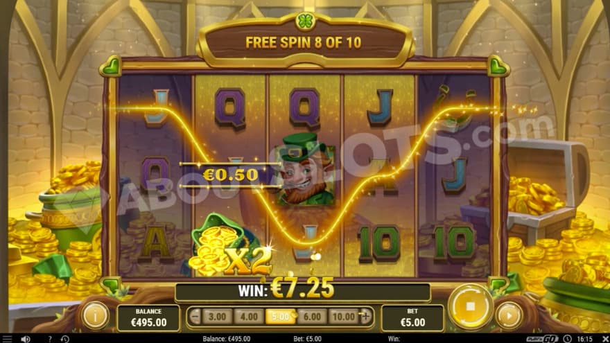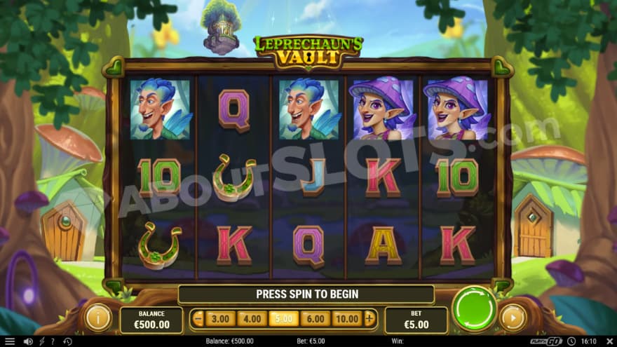 The lower paying symbols are 10, J, Q, K and A. Landing 5 of the same symbol type pays between 1.25X to 2.5X the bet. The medium paying symbols are a horseshoe and a hat. Landing 5 of the same symbol type pays between 5X to 6.25X the bet. The highest paying symbols are the fairies and Larkin himself with background colors of turquoise, purple, yellow and green respectively. Landing 5 of the same symbol type pays between 10X to 37.5X the bet. The golden key is the game's scatter symbol, and the money bag is the game's multiplier wild symbol. Let's find out what the features do.
