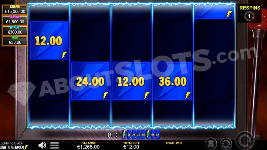 The lightning bolts can appear anywhere on the grid, and landing 6 or more will activate the Lightning Respin. The bolts come with a cash value of 0.5X, 1X, 2X, 3X, 4X, 5X, 7.5X, 10X, 15X, 20X, 30X, 50X, or 100X the bet. There are also the Jackpot bolts Mini, Minor, Major, and Grand, worth 2.5X, 25X, 125X, and 1250X the bet. You can’t make regular wins with the lightning bolts, and they’re not worth anything unless the Lightning Respin is activated. The value of every symbol that contributes to activating the feature will be paid to the player.