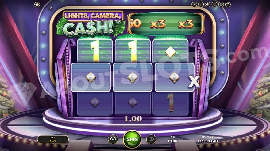 Lights, Camera, Cash! is a video slot from NetEnt with 3 reels and 3 rows. There are 3 paylines, but only the middle one is active from the start, and the other two can be unlocked in the Respins Feature. The Min.bet is 0.1, and the Max.bet is 1. The default RTP is 96.12%, but NetEnt is also releasing several other versions with lower RTPs of about 94%, 93%, 91%, and 88%. The game has high volatility and a max win of 25,000X the bet. The hit frequency of 12% will award a win on about every eight spin.