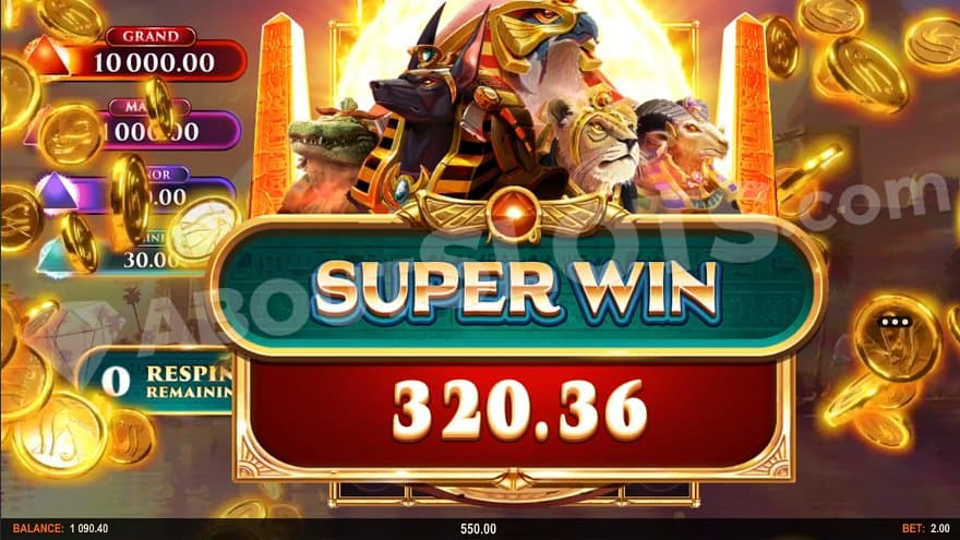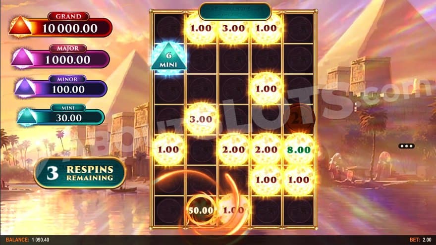 In the base game, landing an Eye of Ra Coin symbol on reel 5 can grow the Collection Pot and trigger this feature. Spin the feature wheel for a chance to win big with the Mini (15X), Minor (50X), Major (500X), or Grand (5,000X) prize.