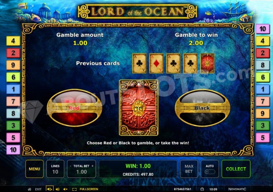 Although the main character in this video slot is Poseidon, the game doesn’t contain much Greek mythology. It somewhat reminds us of the Disney movie The Little Mermaid from 1989, where we get to know the princess mermaid Ariel, her best friend the tropical fish Flounder, and the crab Sebastian. Ariel’s dad, King Triton, has a lot of characteristics similar to Poseidon in Lord of the Ocean, both of them are, for example, wearing the three-pronged spear called trident. The underwater world Greentube has built for us is uniform with pretty basic but good-looking graphics. As usual, the game provider manages to pay attention to the reels' symbols, although there are some nice details in the dark blue background. Everything the player can click on (menu, paytable, number of paylines, and bet amount) is located at the bottom of the game. At the bottom is also where you start a spin or set up the auto-spin. Players who have played other games from Greentube will instantly recognize the music, which is pretty much the same blipping sounds as in Sizzling Hot Deluxe or Book of Ra Deluxe. Just as in mentioned games, the player of Lord of the Ocean has the option to turn off the music and just keep the sounds of the reels or to mute the game completely. This video slot has 10 paylines, and the player can choose how many he wishes to bet on. The game works on all devices: desktops, notepads, and mobiles. For making a win, the player needs at least 3 of the same symbols on a payline, starting from the leftmost reel. For the higher valued symbols is 2 of the same enough to trigger a small win.