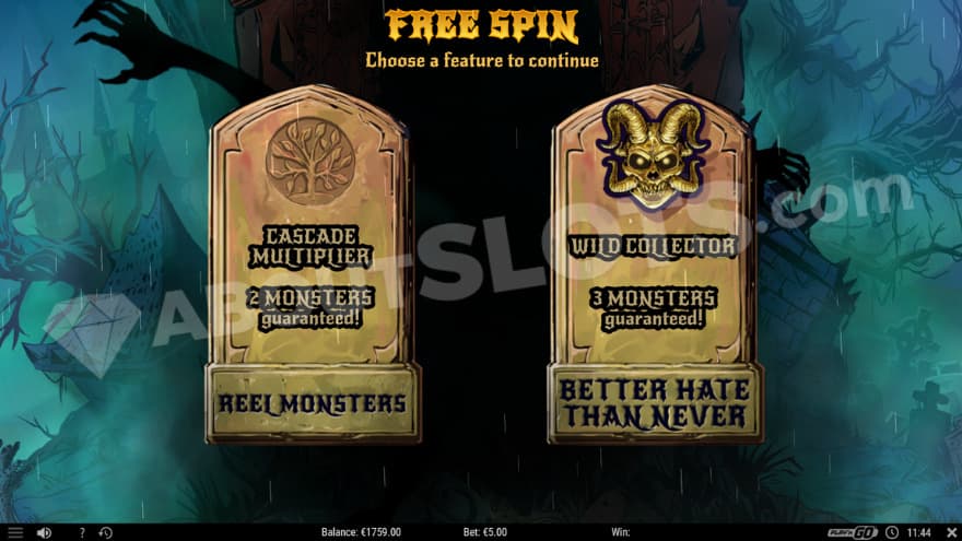 If you activate this bonus game, you will be awarded a Cascade Multiplier. You will receive 1 free spin, where you will have a win multiplier applied to all wins. This multiplier starts at 1X and will then increase by 1X with each cascade that occurs. During this feature you are guaranteed to activate 2 monster features.