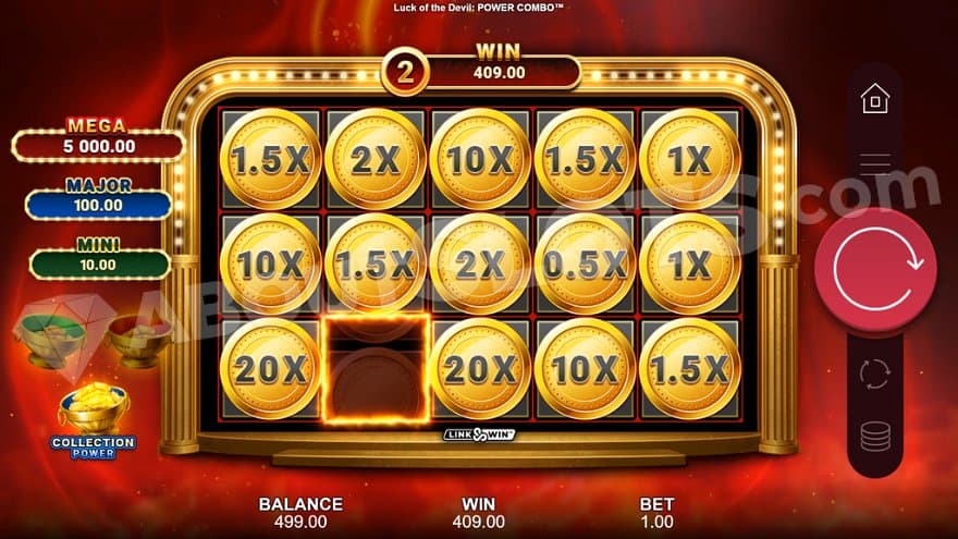 The Link & Win Features can be bought if you want to go straight to the bonus game. The Twin Power costs 23X the bet, the Collection Power 35X the bet, and the Jackpot Power 37X the bet. You can also combine two or all three features. Buying the bonus game with all three Link & Win features activated will set you back 117X the bet.