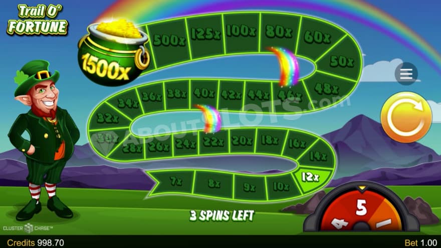 If you reach Level 5, you will activate the Trail O' Fortune Bonus. You will then be moved to a new location that has a trail filled with multiplier prizes and the further you manage to walk on this trail, the higher the instant payout you will receive. The final destination awards you 1500X the bet and in order to move, you will have to make spins on a wheel that determines the number of steps to be taken. During your walk on this trail, you can land on rainbow bridges that will let you jump ahead and if you discover emeralds, you will receive an extra spin on the wheel.