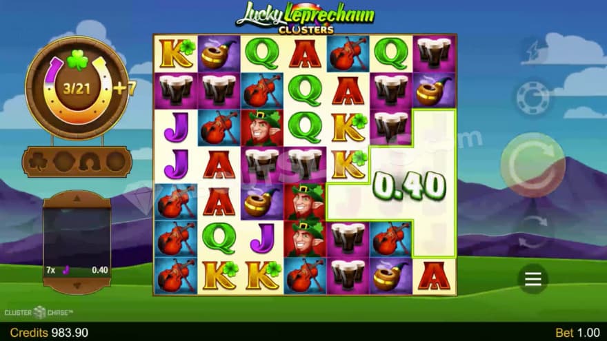 Lucky Leprechaun Clusters is a video slot from Microgaming that features 7 reels and 7 rows. You create a winning combination by landing 5 or more of the same symbol type in a cluster. You can choose between making a Min.bet of 0.10 and a Max.bet of 50. Lucky Leprechaun Clusters has an RTP of 96.31% and a high volatility, where you can win up to 4600X the bet.