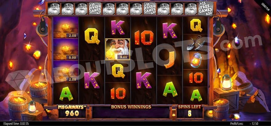 Lucky Nuggets Megaways is a video slot from Blueprint Gaming with 6 reels and 2-5 rows that change every spin. There are 15625 ways to win with the maximum number of rows. The Min.bet is 0.10 and the Max.bet is 10. Gold mining the Lucky Nuggets way is done to an RTP of 95.50%. The game’s volatility is high, and Blueprint Gaming claims that the max win is 50000X the bet, although that number sounds too good to be true.