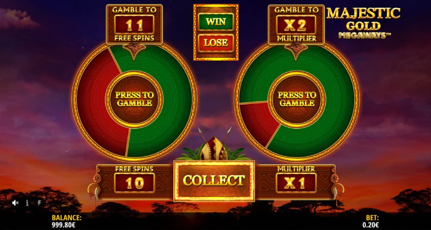 Within this gaming adventure set on the African savannah, we have a bunch of great features to help us in our quest for the big wins. The features are Wild Symbol, Cascading Wins, Mystery Symbols, Max Megaways, Gold Bet, Gamble, Free Spins and Bonus Buy.
