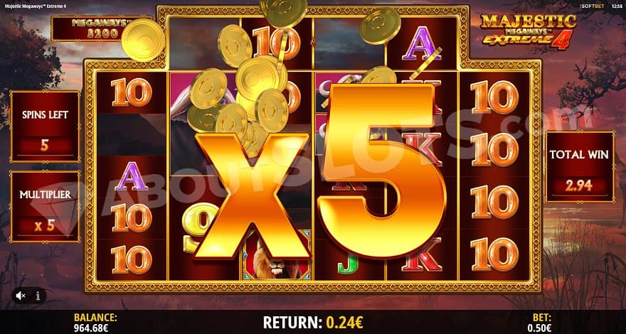 The graphics of Majestic Megaways Extreme 4 resemble Majestic Gold Megaways a lot. We are on the Savannah when the sun is about to set, with red and yellow clouds in the sky. A few birds are flying through, passing behind the reels that look almost the same as in the previous game. They have a golden frame with an extra horizontal reel on top of reels 2, 3, 4, and 5. The sizes of the reels change between 2 and 7 on each spin. The big difference between the two games is that Majestic Megaways Extreme 4 has 4 game sets crammed in on the screen when its precursor only has one. This raises the maximum number of symbols from 42 to 168 and pushes the ways to win to an incredible 470596 ways. To make a win, you’ll need to land at least 3 of the same symbols on adjacent reels, starting with the first reel to the left. You can play the game on all devices, such as desktops, notepads, and mobile phones.
