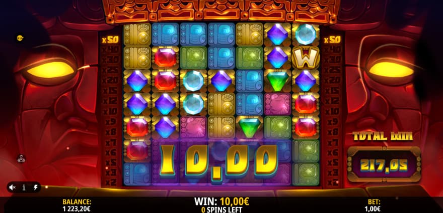 We won’t attempt to decrypt the Mayan language, but the lower paying symbols are rounded squares in the colors brown, blue, red, green, and purple. Connecting 5 of these pays 0.1x the bet, which increases the more symbols are included in the cluster. The higher paying symbols are gems in the colors light blue, red, green, and blue. If you land 5 of the same symbol type, it pays 0.25x-0.5x the bet. The game’s wild symbol is a big W symbol, which substitutes all paying symbols. Lastly, we have the scatter symbol a big temple with “bonus” written on it. Landing 3 or more will trigger the Free Spins.
