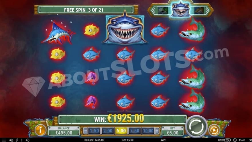 During your spins, up to 3 small fish symbols can be randomly selected to become upgrading symbols. They will then turn into one of the highest paying shark symbols and only the small fish symbols can be upgraded.