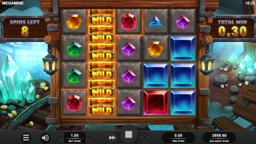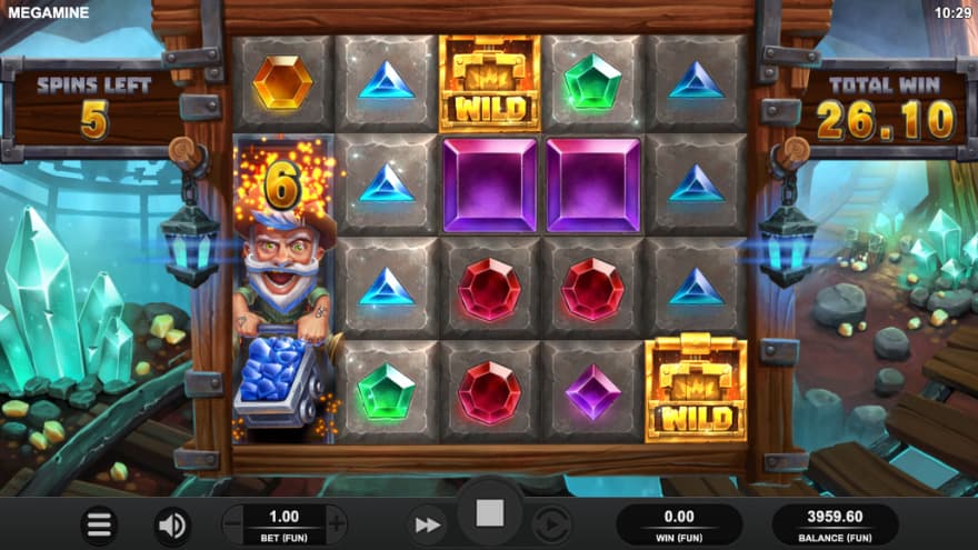 In this fast-paced mining adventure, we have a bunch of great features to help us in the hunt for the big wins. The features are Wild Symbol, Nudging Mystery Stacks, Mega Free Spins and Bonus Buy.