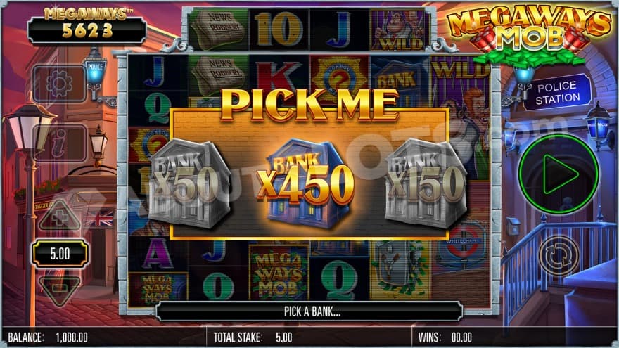 The lower paying symbols are 10, J, Q, K and A. The medium paying symbols are a toolbox, a detective, a street sign and a newspaper. The highest paying symbol is the Megaways Mob logo. During the spins you can land a festive amount with different special symbols, where the pick me bonus symbol is a bank and the red question mark surrounded by beautiful gold decoration is the game's mystery symbol. The two mob members are the game's wild symbol, and the scatter symbol is a bank vault. Let's find out what the features do.