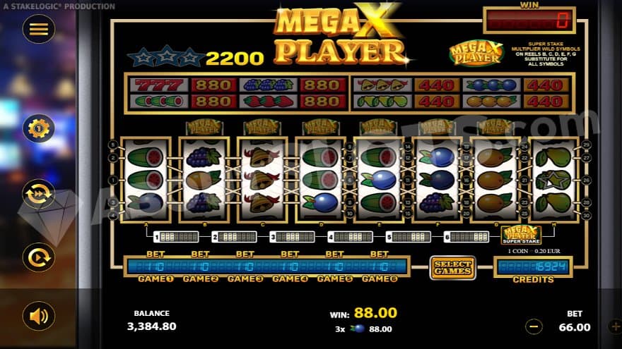 MegaXPlayer is a video slot from Stakelogic that can be played on between 3 and 8 reels. There are 3 rows and 5-30 paylines, depending on the number of active reels. The base bet goes from the Min.bet 0.20 and the Max.bet 66, which can be doubled to 132 with the Super Stake feature. MegaXPlayer has low-mid volatility (2/5) and a max win of 3006X the bet.