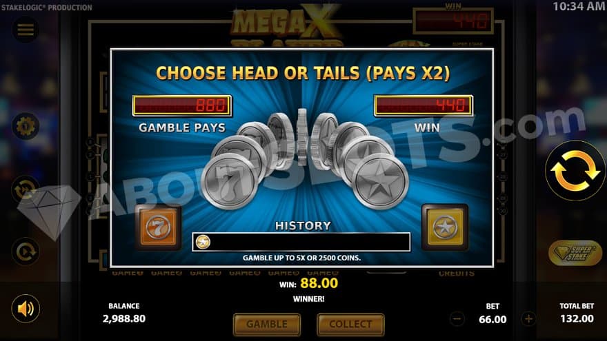 Every win can be gambled in an all-or-nothing game. The player gets to foretell the outcome of a coin flip, which will double the win for a correct answer and result in losing the win if the answer is wrong. If a gamble is won, the player can try to double it once again or return to the base game by collecting the money.