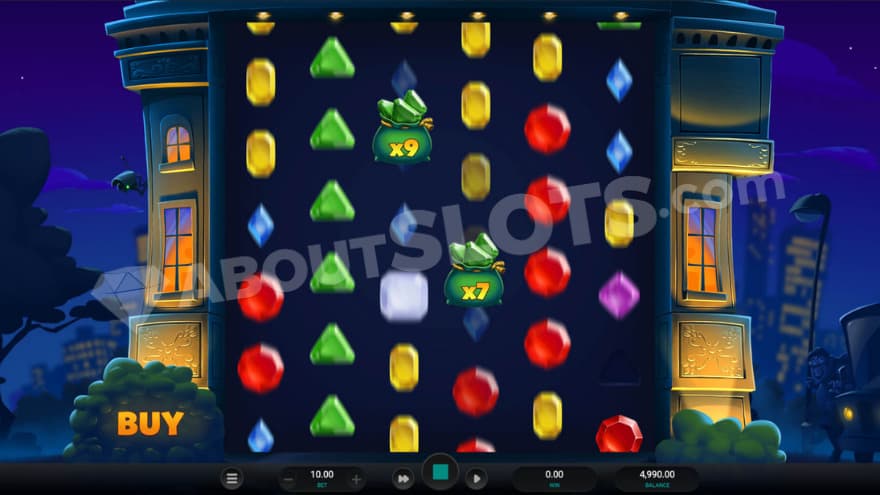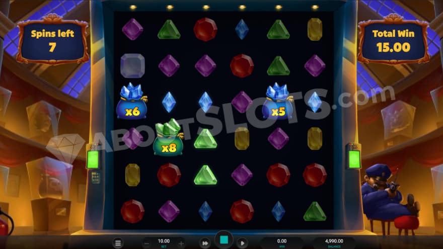 When you create a winning cluster, each symbol included will have a different value. The different gemstones in blue, green, purple, yellow, red and white are worth 0.1X, 0.2X, 0.5X, 0.7X, 1X and 2X each respectively. For example, if you have 6 yellow gemstones in a cluster, the payout is 4.2X (0.7 x 6). The great robber is the game's scatter symbol and 3 or more of this activates the free spins feature. Let's find out what the features do.