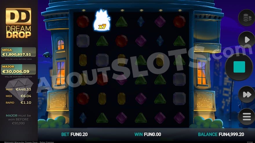 Midnight Marauder Dream Drop is a video slot from Relax Gaming with 6 reels and 6 rows. The game doesn’t have regular paylines, but wins are made by landing 5 or more symbols of the same kind in a cluster, connected horizontally or vertically. The Min.bet is 0.1, and the Max.bet is 30. The game’s RTP is 94%, which includes a 12% contribution to the Dream Drop Jackpot. The mid-high volatility is described as 4 of 5. The max win is capped at 10,000X the bet, except for the Dream Drop Jackpot, which can award up to €3,000,000. The hit frequency of 11.51% means that you, on average, have to spin almost 9 times to make a win.