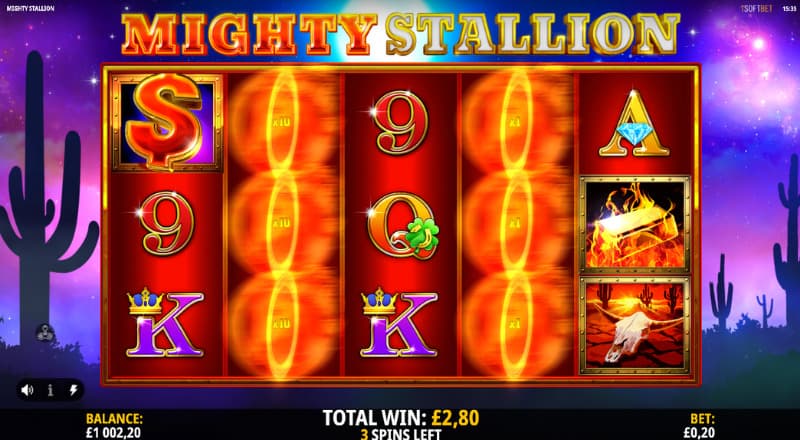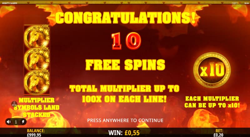 Although Respins and giant wilds are very entertaining to get, you can also take part in free spins here. To do this, land 3 or more Mighty Stallion Scatter symbols. Where you will receive according to the paytable a cash prize. Where 3 Scatters = 2X payout, 4 Scatters = 10X payout and 5 Scatters = 100X payout. You will also be welcomed with 10 free spins, where under the feature you can also succeed in obtaining more free spins. 3 or more of the scatters give 5 more free spins.