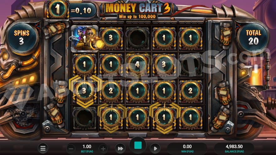 You don’t make wins the usual way in this game. Your only objective is to trigger the Re-Spins by landing 3 Symbols anywhere on the grid. On a base spin, you can either land a symbol or a blank on each position. In other words, forget about paylines or other ways to make regular wins. Money Cart 3 is available on mobile phones and other devices.