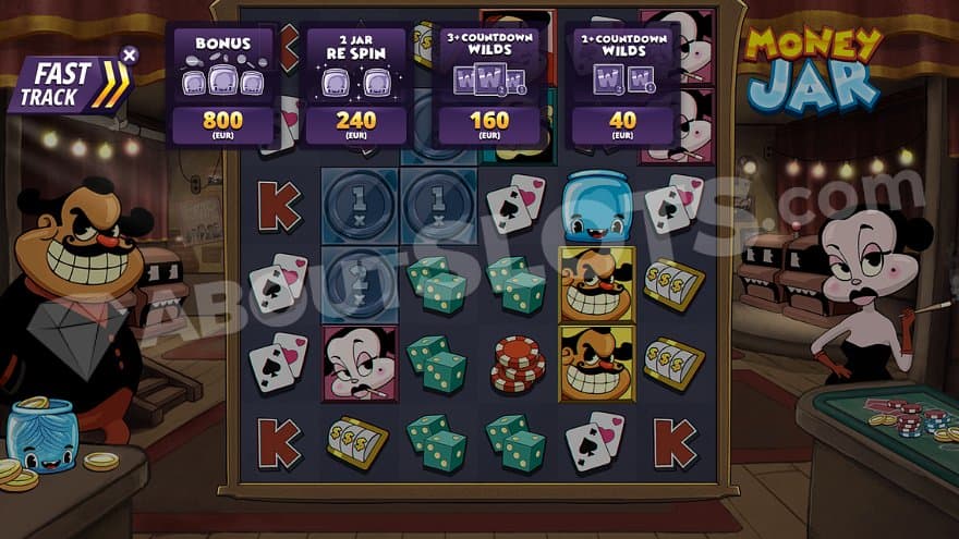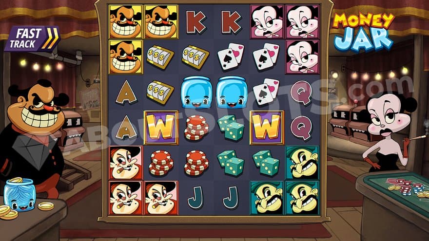 There are an abundance of symbols in the game, with 12 regular paying ones. The lower-paying symbols are J, Q, K, and A. They all pay the same, up to 0.25X the bet for a combination of 6 symbols. The medium-paying symbols are dice, playing card, money chip, and dollar signs. They will give the player 0.6X the bet for a win of 6 symbols. The high-paying symbols are four cartoon-looking people. A pirate-looking man, the Betty Boop-look-alike, a woman smoking a cigar, and the big man with the grin, will pay between 1.2X and 3.5X the bet. The Wild Symbol substitutes all mentioned symbols, and the Scatter Symbol is a blue money jar with eyes that collects Coin Symbols in several features. There are also five Special Symbols that can land during the Money Jar Bonus Game.